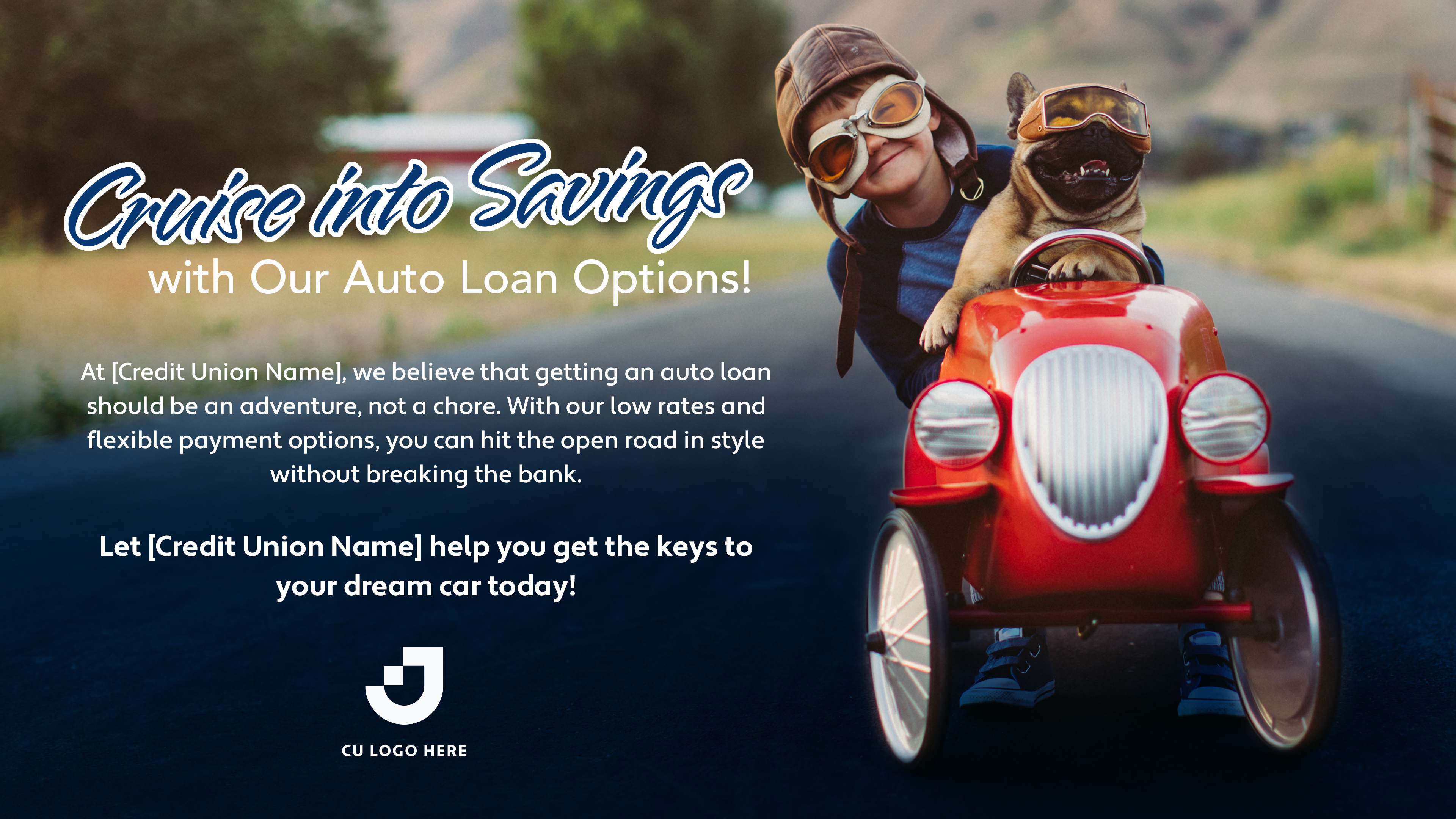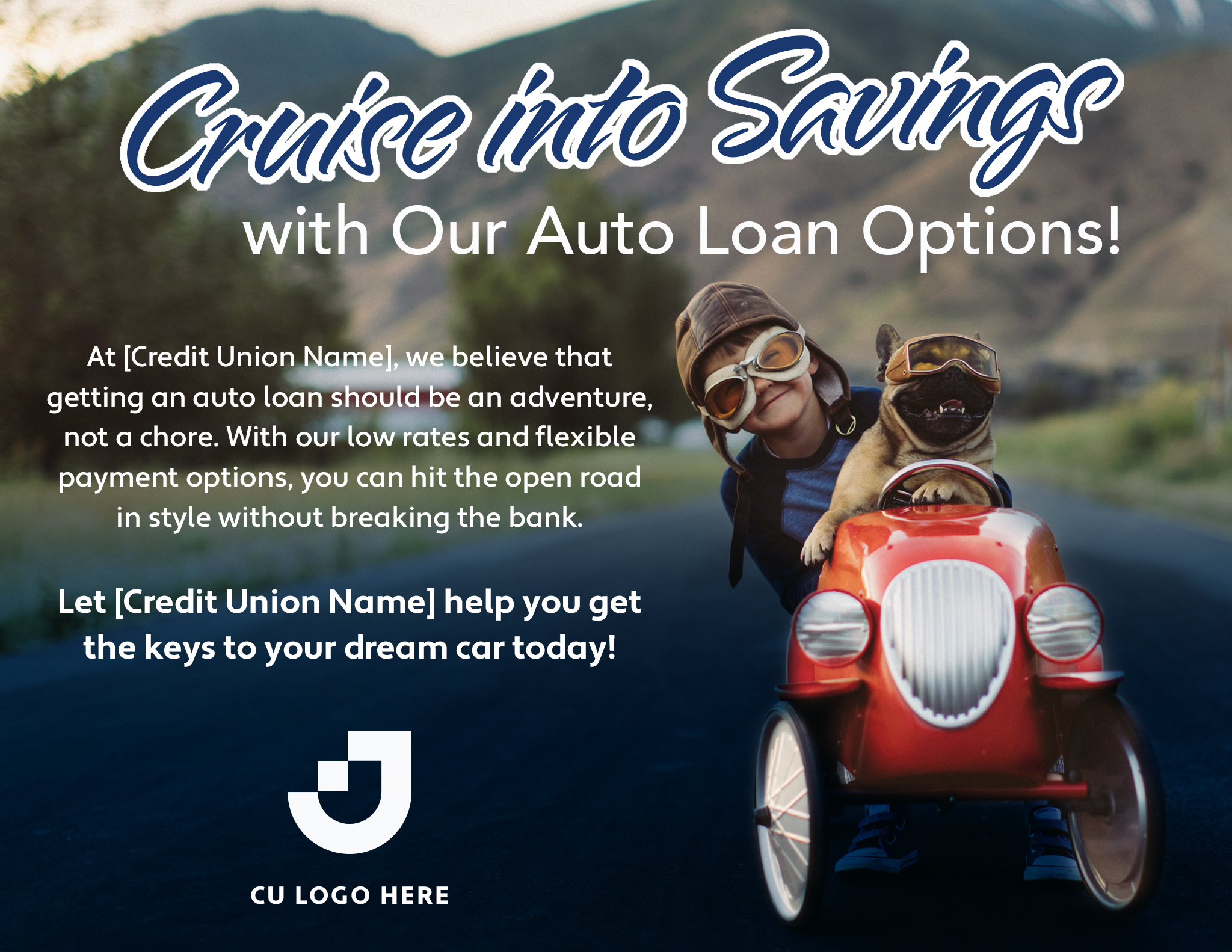Rev up your credit union's growth with our dynamic Auto Loan Campaign! Whether you're aiming for a grand entrance or a smooth ride, our turnkey solution offers tailored options for both large and small packages. From attention-grabbing digital displays to eye-catching posters, engaging social media posts to sleek web banners, our exquisitely crafted marketing items are designed to accelerate your outreach. With a lightning-fast turnaround of just one business day, you'll have everything you need to drive interest and engagement. Seize the opportunity to showcase your competitive auto loan rates and flexible terms, and let our campaign help you cruise ahead of the competition.